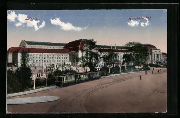 AK Leipzig, Strassenbahn passiert den Hauptbahnhof