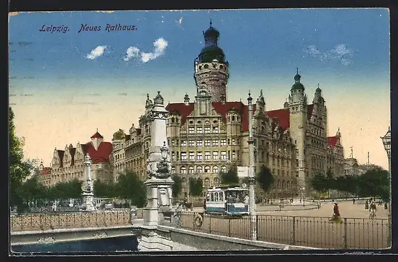 AK Leipzig, Strassenbahn vor dem Rathaus
