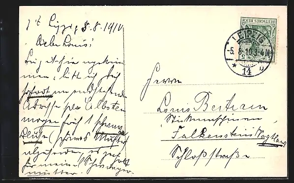 Personenbezogene Daten auf der Rückseite der Karte wurden durch blauen Textmarker unkenntlich gemacht. Die blauen Stellen sind auf die Vorderseite durchgeweicht und wirken sich negativ auf das Postkartenfoto aus