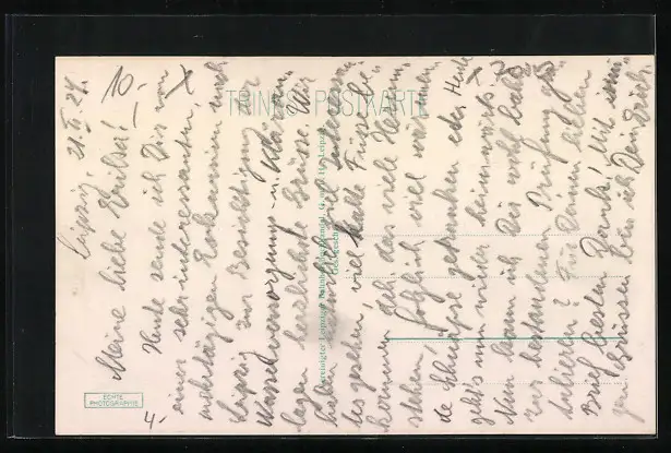 Personenbezogene Daten auf der Rückseite der Karte wurden durch blauen Textmarker unkenntlich gemacht. Die blauen Stellen sind auf die Vorderseite durchgeweicht und wirken sich negativ auf das Postkartenfoto aus