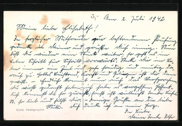 Personenbezogene Daten auf der Rückseite der Karte wurden durch blauen Textmarker unkenntlich gemacht. Die blauen Stellen sind auf die Vorderseite durchgeweicht und wirken sich negativ auf das Postkartenfoto aus