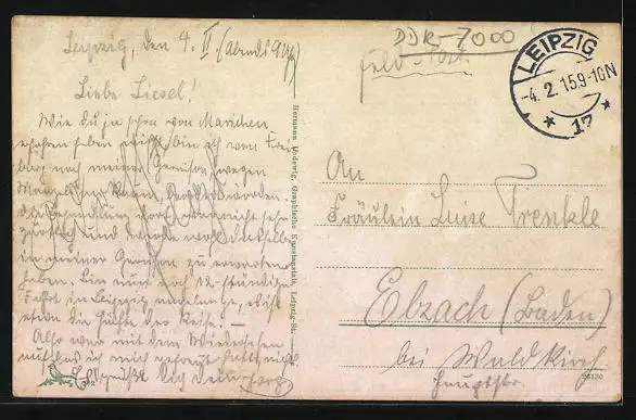 Personenbezogene Daten auf der Rückseite der Karte wurden durch blauen Textmarker unkenntlich gemacht. Die blauen Stellen sind auf die Vorderseite durchgeweicht und wirken sich negativ auf das Postkartenfoto aus