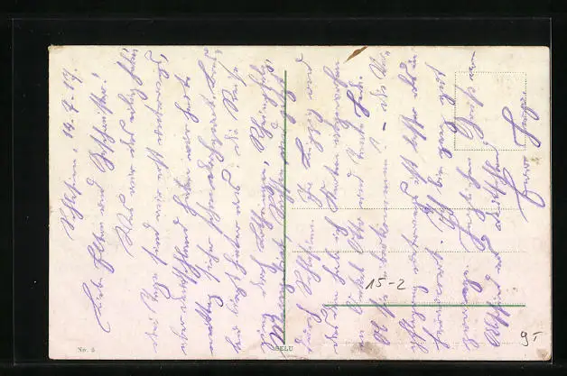 Personenbezogene Daten auf der Rückseite der Karte wurden durch blauen Textmarker unkenntlich gemacht. Die blauen Stellen sind auf die Vorderseite durchgeweicht und wirken sich negativ auf das Postkartenfoto aus