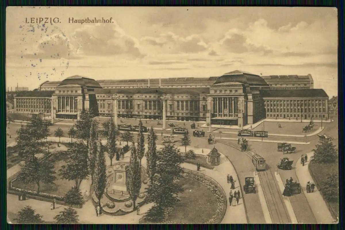 AK - Leipzig in Sachsen - Hauptbahnhof Straßenbahn Autos .... - 1913 gelaufen
