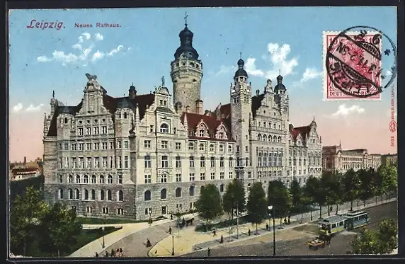 AK Leipzig, neues Rathaus, Strassenbahn
