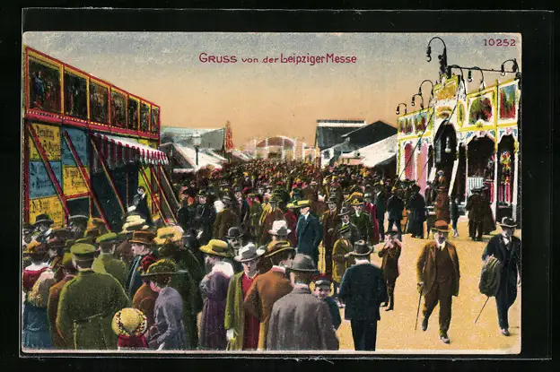 AK Leipziger Messe mit Besuchern vor Buden und Attraktionen