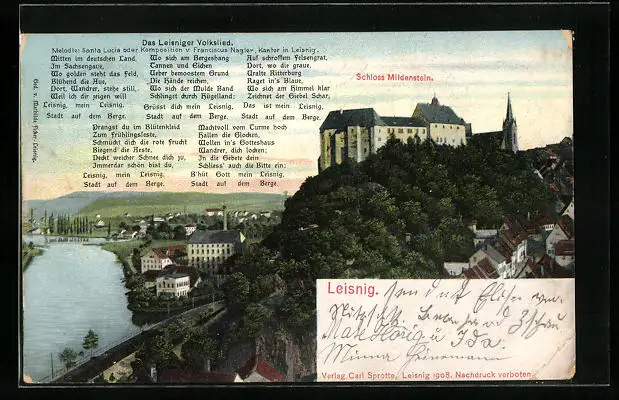 AK Leisnig, Ortsansicht mit Schloss Mildenstein, Das Leisniger Volkslied