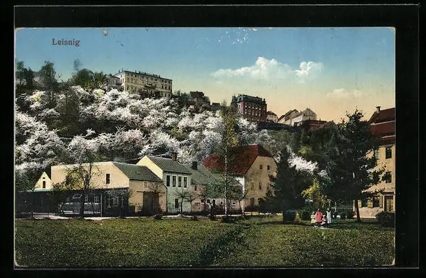 AK Leisnig, Ortsansicht mit blühenden Bäumen