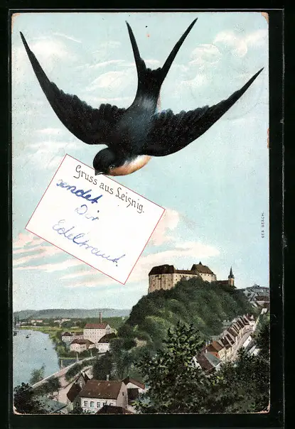 AK Leisnig, Teilansicht, Schwalbe mit Brief im Schnabel