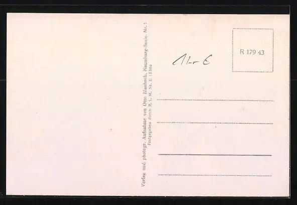 Personenbezogene Daten auf der Rückseite der Karte wurden durch blauen Textmarker unkenntlich gemacht. Die blauen Stellen sind auf die Vorderseite durchgeweicht und wirken sich negativ auf das Postkartenfoto aus
