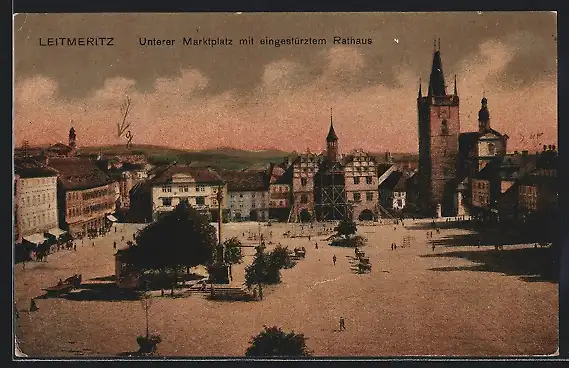 AK Leitmeritz, Unterer Marktplatz mit eingestürztem Rathaus