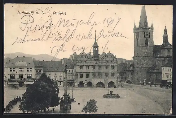 AK Leitmeritz a. E., Stadtplatz mit Denkmal