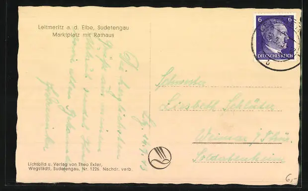 Personenbezogene Daten auf der Rückseite der Karte wurden durch blauen Textmarker unkenntlich gemacht. Die blauen Stellen sind auf die Vorderseite durchgeweicht und wirken sich negativ auf das Postkartenfoto aus