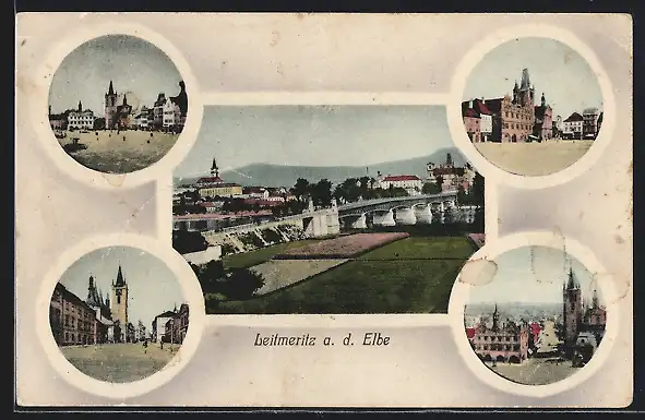AK Leitmeritz a. d. Elbe, Panorama mit Brücke, Rathaus, Strassenpartie