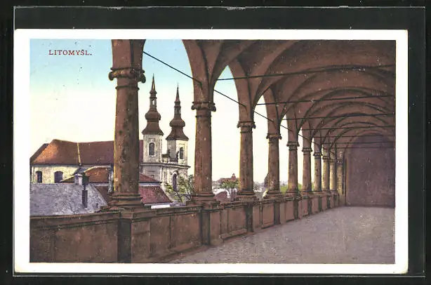 AK Leitomischl / Litomysl, Laubengang mit Blick auf die Kirche