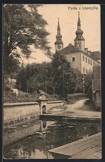 AK Leitomischl / Litomysl, Strassenpartie am Wasser, Blick zur Kirche