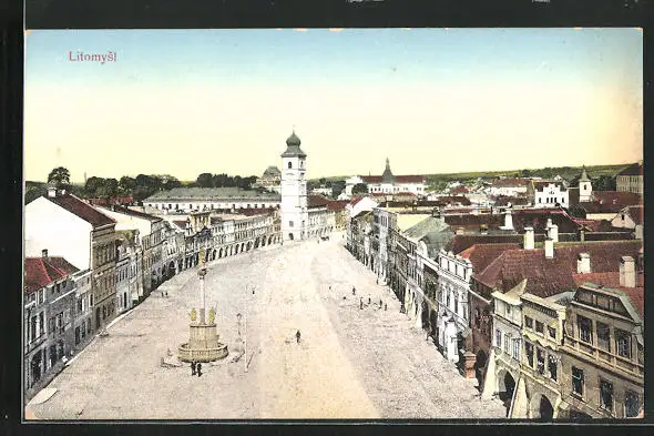 AK Leitomischl / Litomysl, Strassenpartie mit Gebäudeansicht und Denkmal