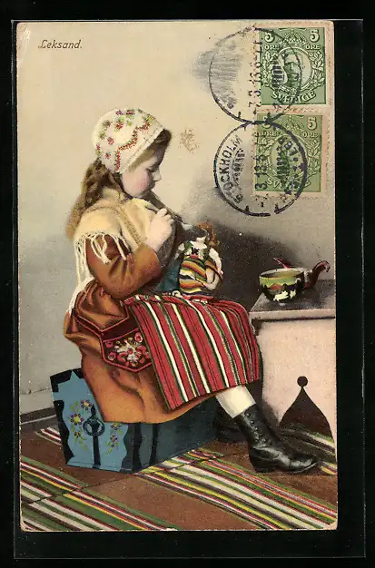 AK Leksand, Mädchen in Tracht füttert ihre Puppe