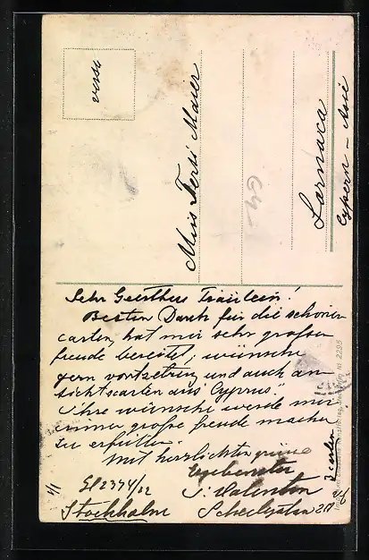 Personenbezogene Daten auf der Rückseite der Karte wurden durch blauen Textmarker unkenntlich gemacht. Die blauen Stellen sind auf die Vorderseite durchgeweicht und wirken sich negativ auf das Postkartenfoto aus