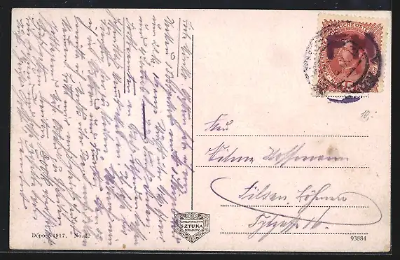 Personenbezogene Daten auf der Rückseite der Karte wurden durch blauen Textmarker unkenntlich gemacht. Die blauen Stellen sind auf die Vorderseite durchgeweicht und wirken sich negativ auf das Postkartenfoto aus
