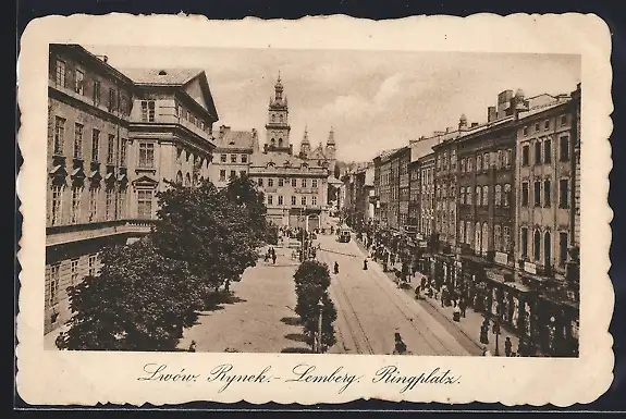 AK Lemberg-Lwow, Ringplatz aus der Vogelschau mit Strassenbahn