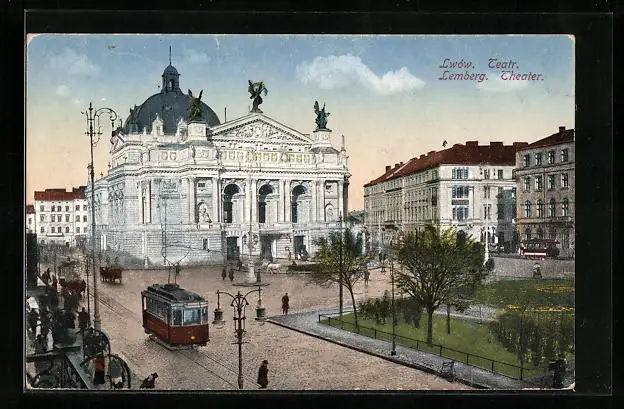 AK Lemberg / Lwow, Strassenbahn am Theater, Teatr