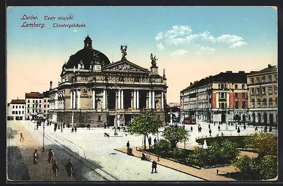 AK Lemberg, Strassenbahn vor dem Theatergebäude