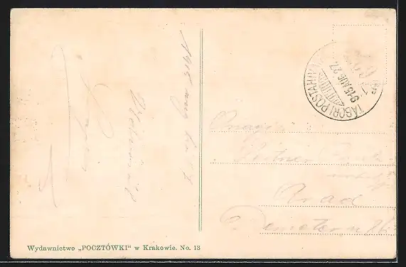 Personenbezogene Daten auf der Rückseite der Karte wurden durch blauen Textmarker unkenntlich gemacht. Die blauen Stellen sind auf die Vorderseite durchgeweicht und wirken sich negativ auf das Postkartenfoto aus