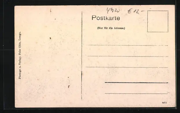 Personenbezogene Daten auf der Rückseite der Karte wurden durch blauen Textmarker unkenntlich gemacht. Die blauen Stellen sind auf die Vorderseite durchgeweicht und wirken sich negativ auf das Postkartenfoto aus