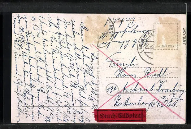Personenbezogene Daten auf der Rückseite der Karte wurden durch blauen Textmarker unkenntlich gemacht. Die blauen Stellen sind auf die Vorderseite durchgeweicht und wirken sich negativ auf das Postkartenfoto aus