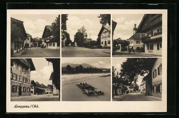 AK Lenggries /Obb., Gasthof zur Post, Strassenpartie mit Cafe, Strand mit Floss