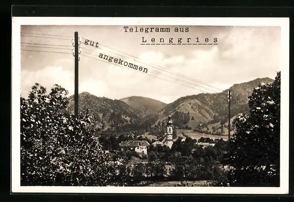 AK Lenggries, Ortspartie mit Telegraphenmast