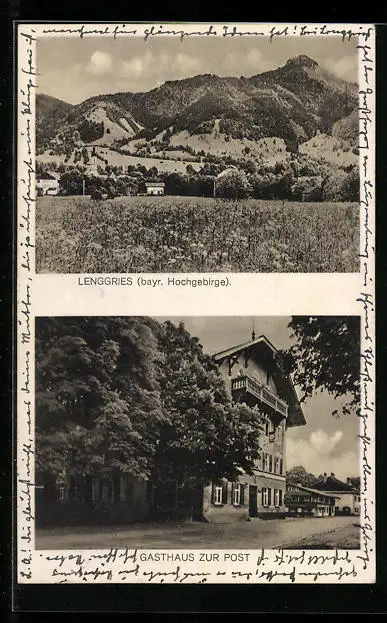 AK Lenggries, Partie am Gasthaus zur Post, Blick zur Stadt