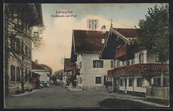 AK Lenggries, Partie an der Dorfstrasse mit Post