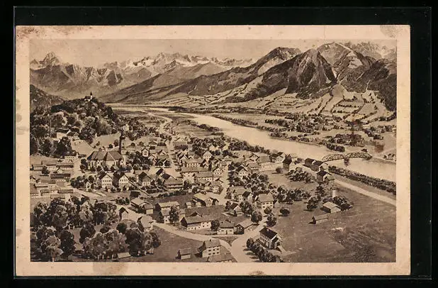 AK Lenggriess /Isar, Gesamtansicht mit Bergpanorama von oben