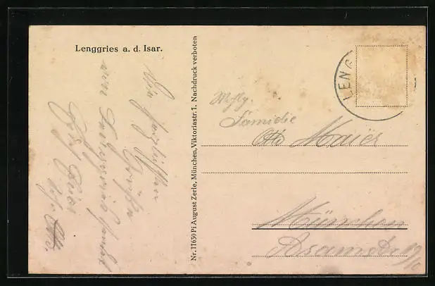 Personenbezogene Daten auf der Rückseite der Karte wurden durch blauen Textmarker unkenntlich gemacht. Die blauen Stellen sind auf die Vorderseite durchgeweicht und wirken sich negativ auf das Postkartenfoto aus