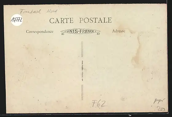 Personenbezogene Daten auf der Rückseite der Karte wurden durch blauen Textmarker unkenntlich gemacht. Die blauen Stellen sind auf die Vorderseite durchgeweicht und wirken sich negativ auf das Postkartenfoto aus