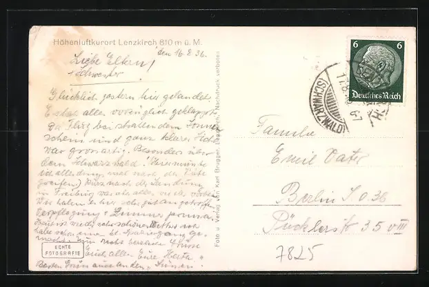 Personenbezogene Daten auf der Rückseite der Karte wurden durch blauen Textmarker unkenntlich gemacht. Die blauen Stellen sind auf die Vorderseite durchgeweicht und wirken sich negativ auf das Postkartenfoto aus