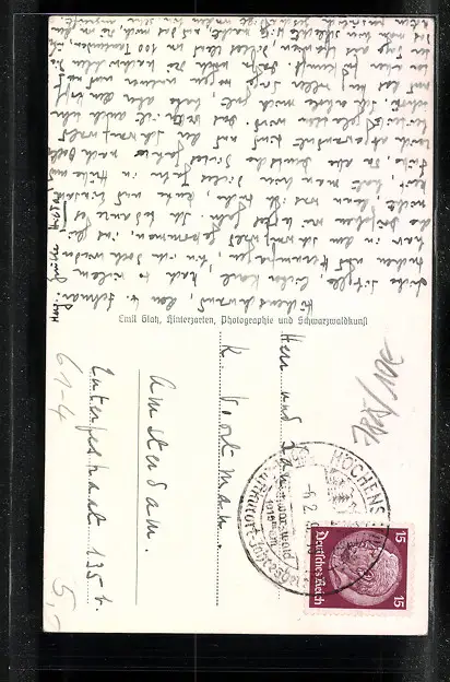 Personenbezogene Daten auf der Rückseite der Karte wurden durch blauen Textmarker unkenntlich gemacht. Die blauen Stellen sind auf die Vorderseite durchgeweicht und wirken sich negativ auf das Postkartenfoto aus