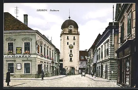 AK Leoben, Blick zum Stadtturm und Gasthaus Zum Mohren