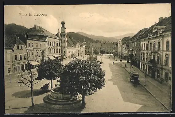 AK Leoben, Brunnen und Denkmal auf dem Hauptplatz