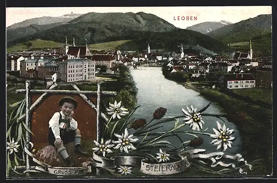 AK Leoben, Kleiner Wanderbursche vor der Ortsansicht