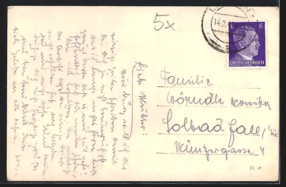 Personenbezogene Daten auf der Rückseite der Karte wurden durch blauen Textmarker unkenntlich gemacht. Die blauen Stellen sind auf die Vorderseite durchgeweicht und wirken sich negativ auf das Postkartenfoto aus