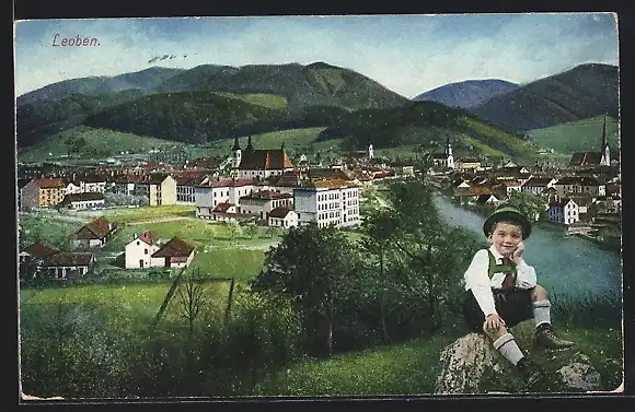 AK Leoben, Ortsansicht mit Kind in Tracht im Vordergrund