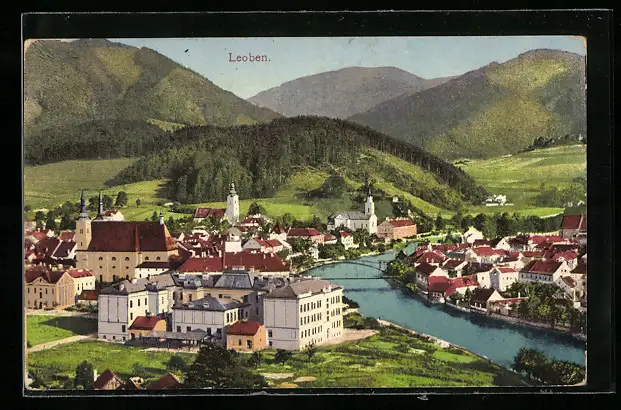 AK Leoben, Ortsansicht mit Kirche und Brücke