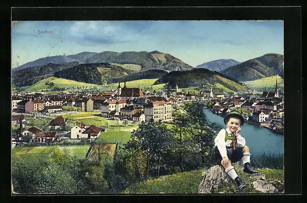 AK Leoben, Ortsansicht mit Trachtenbub