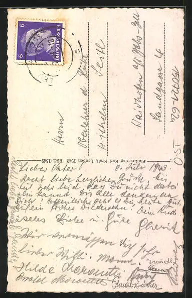 Personenbezogene Daten auf der Rückseite der Karte wurden durch blauen Textmarker unkenntlich gemacht. Die blauen Stellen sind auf die Vorderseite durchgeweicht und wirken sich negativ auf das Postkartenfoto aus
