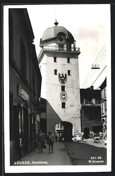 AK Leoben, Strassenpartie am Stadtturm, VW-Käfer