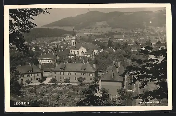 AK Leoben, Teilansicht von einer Anhöhe mit Blick auf Kirche