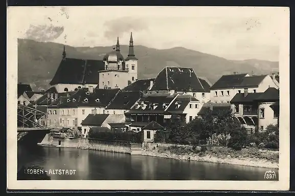 AK Leoben, Uferpartie mit Kirche in der Altstadt